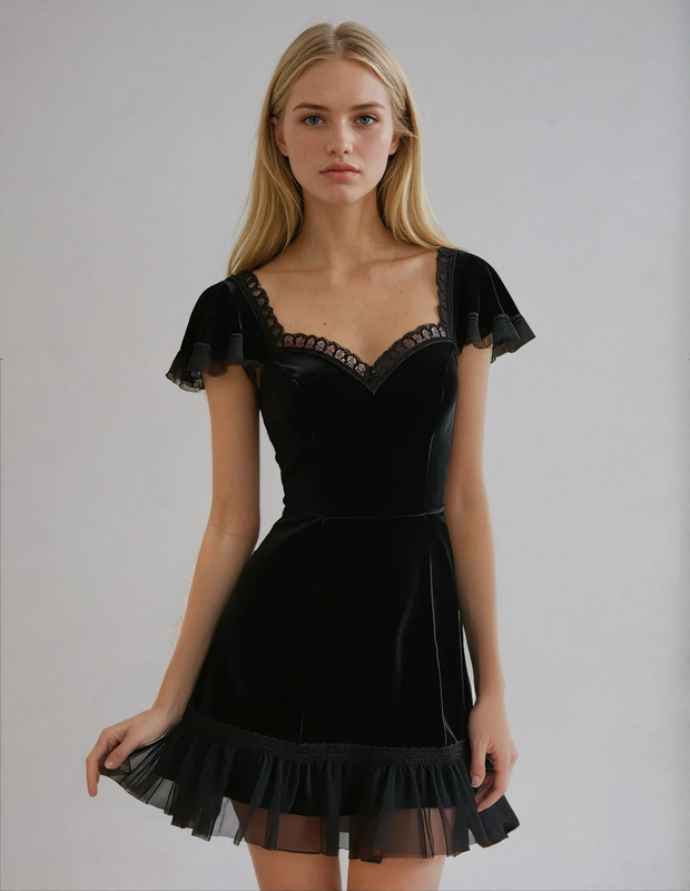 Model wearing an black velvet mini dress with a body-hugging fit, cap sleeve design, and flared bell sleeves. The dress features black lace trim at the neckline, shoulders, and hem, with a ruffled hemline and sheer tulle accents for a romantic, vintage-inspired look.