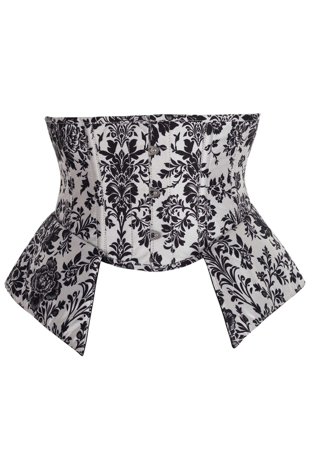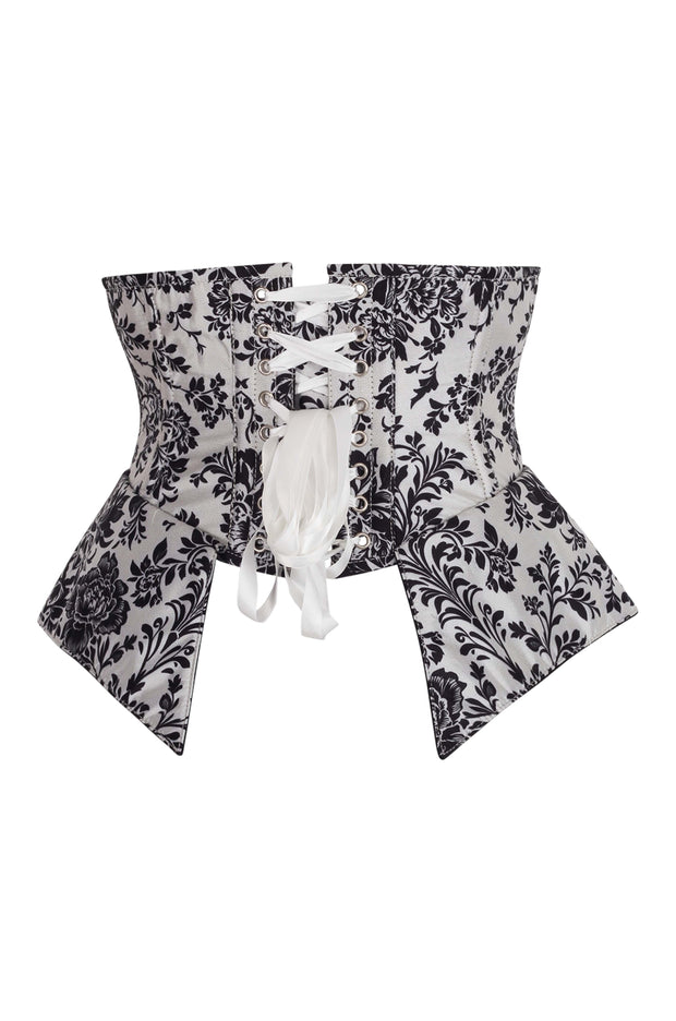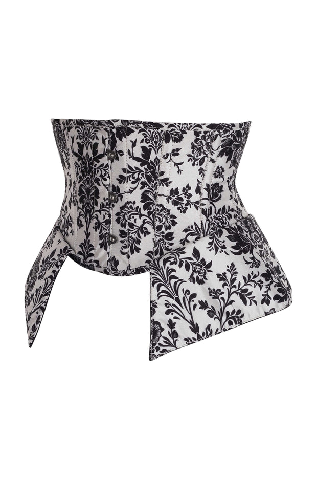 This luxurious ensemble features a striking black-on-white floral damask print, exuding regal sophistication and gothic allure. Perfect for making an unforgettable entrance at any special event. Designed for impeccable waist shaping and support, this corset features durable steel boning and adjustable back lacing for a flawless fit. Lined with 100% premium cotton, it ensures comfort while maintaining a beautifully structured silhouette.
