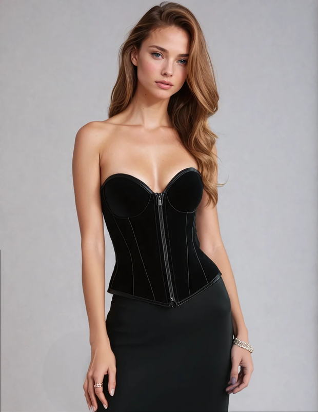 Enhance your elegant look with our Nevada Black Velvet Corset. Featuring a convenient front zipper, our overbust corset provides a flattering and comfortable fit. Made with high-quality velvet, this corset is perfect for any formal occasion. Elevate your style and confidence with our luxurious corset.