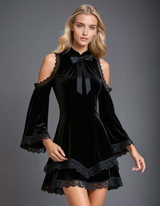 This black velvet dress features a delicate lace trim and flared sleeves. Crafted from luxurious fabric, this dress exudes elegance and sophistication. Perfect for special occasions, it adds a touch of glamour to any outfit. Elevate your style with the Riva Cold Shoulder Black Dress.