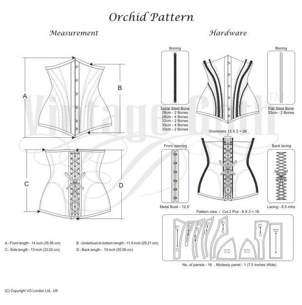 - 14 Spiral steel bones are distributed all around the corset