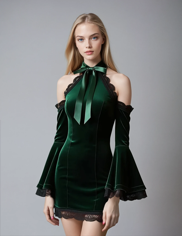This elegant Blythe Cold Shoulder Dress features a luxurious green velvet material accented by delicate lace detailing. The flattering flare sleeves add a touch of sophistication to this cold shoulder style. Elevate your wardrobe with this timeless and stylish dress.