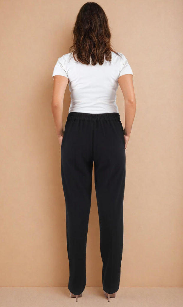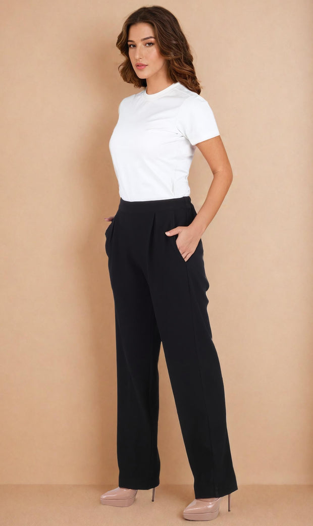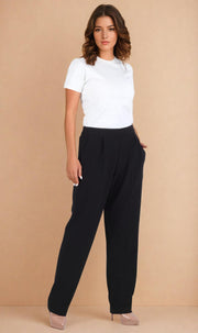 The Isadora Pleated Knitted Trouser is made of a durable and comfortable poly knit fabric in timeless black. The pleated design adds an elegant touch to these versatile trousers, making them a stylish option for any occasion.