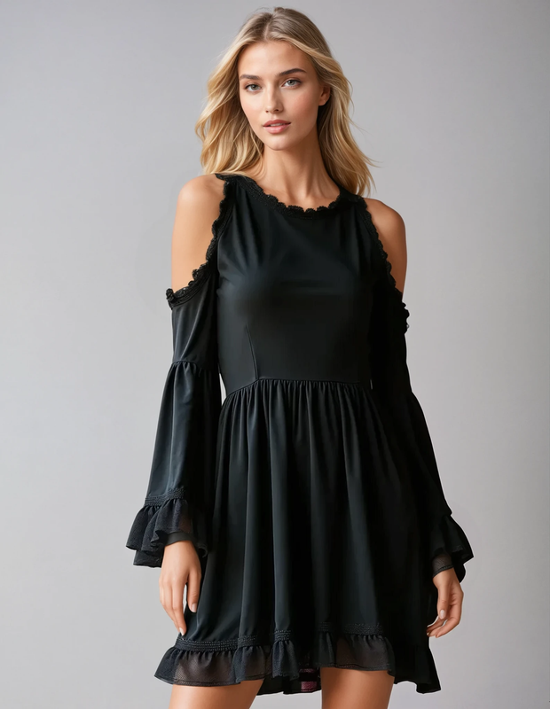 Expertly crafted from high-quality polyester, the Ceil Cold Shoulder Black Dress exudes elegance and sophistication. The lace trim detail adds a touch of charm, while the flare sleeves add a modern twist. Perfect for any occasion, this short dress will make a statement and turn heads.
