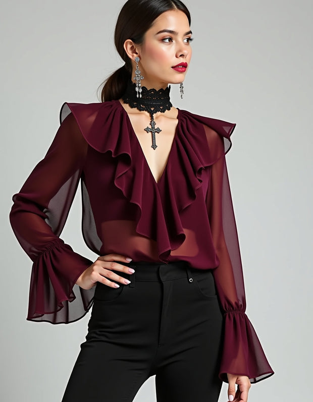 This Delanie Maroon Georgette Top is the perfect blend of style and sophistication. Made of lightweight chiffon, this V-neck top features long sleeves for a flattering fit. The luxurious maroon color adds a touch of elegance to any outfit. Elevate your wardrobe with this must-have top.