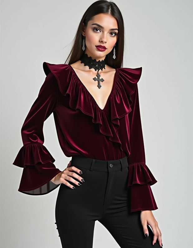 This Elena Maroon Velvet Top features a flattering v-neck design and elegant flare sleeves, adding sophistication and style to any outfit. Made with high-quality velvet fabric, this top provides both comfort and luxurious texture that will make you stand out in any occasion.