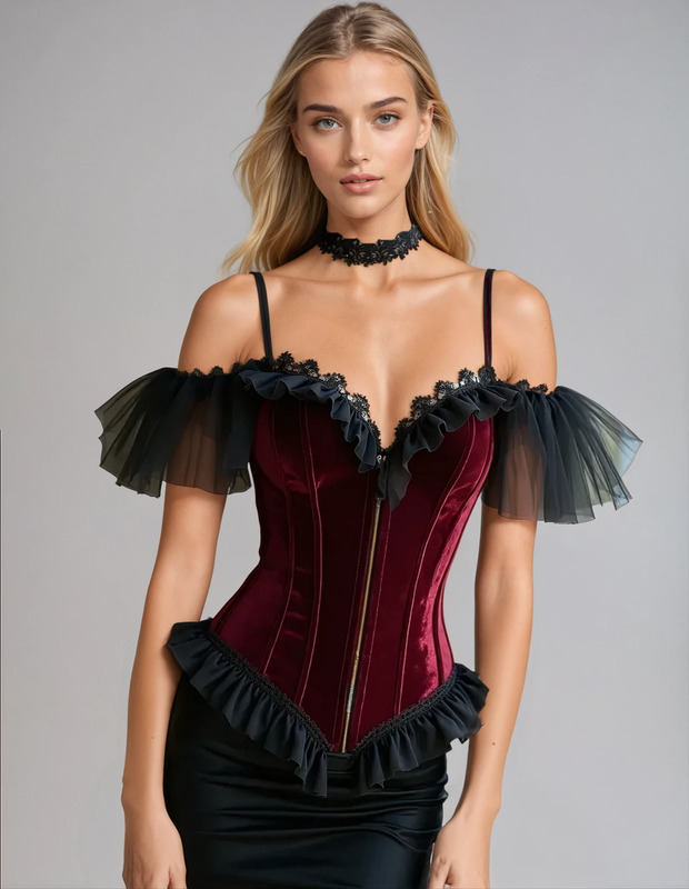 Expertly crafted with luxurious maroon velvet and delicate lace trim, the Elsje Cold Shoulder Velvet Corset is a stunning piece that provides both style and comfort. Its front zipper closure allows for easy wear, making it a practical and elegant addition to any wardrobe.