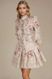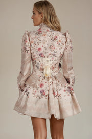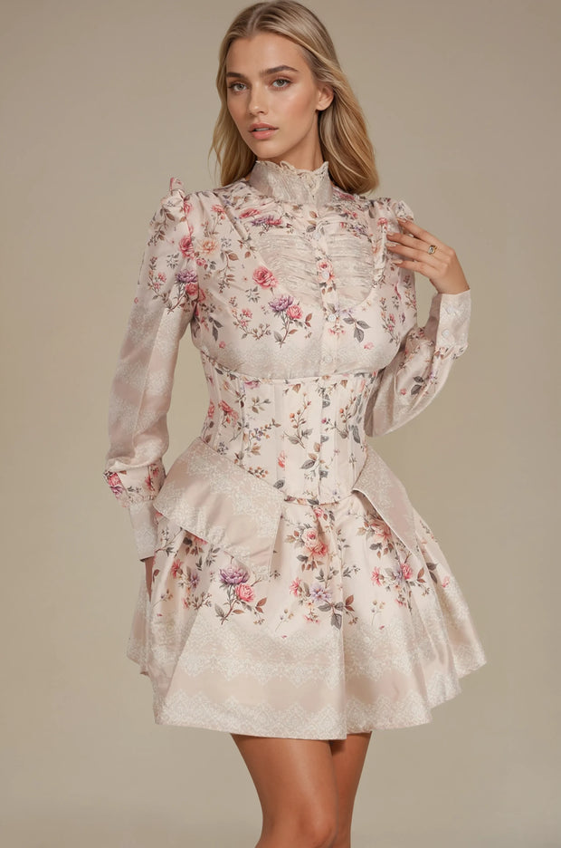 Shirt: Completing the look is a high lace-trimmed collar shirt with ruched detailing and softly puffed sleeves. The romantic rose print and subtle lace accents create a perfectly balanced look of vintage grace and modern elegance.